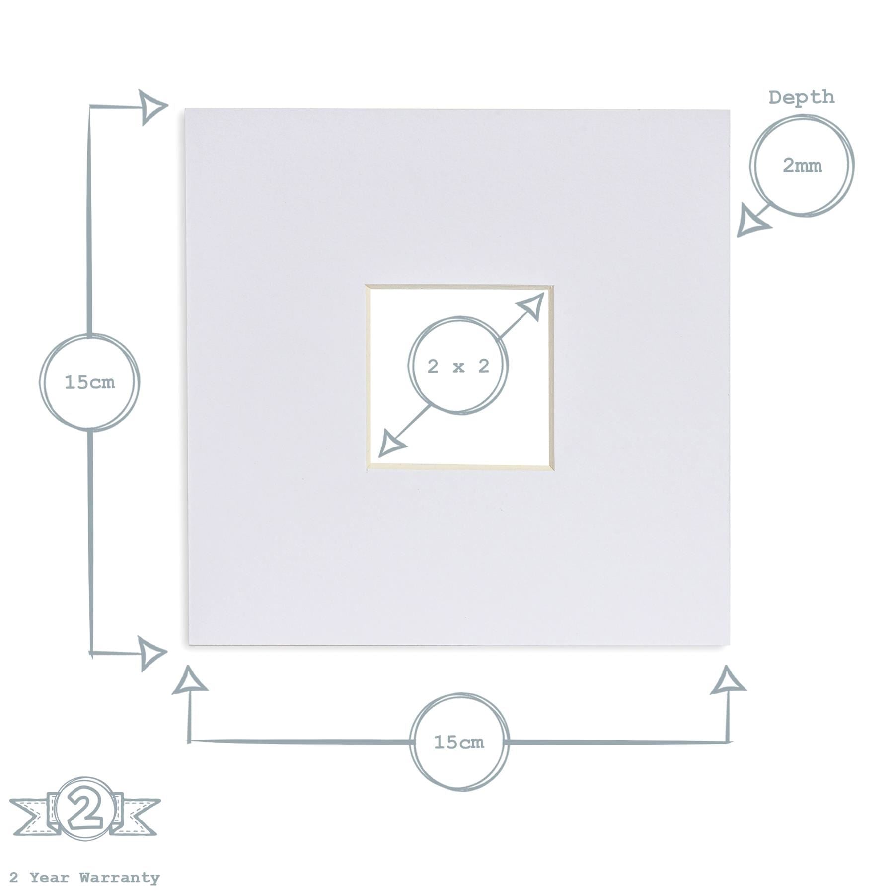 • Dimensions: Fits Frames: 6 x 6 inches Aperture: 2 x 2 inches Width: 15cm Depth: 0.5cm Height: 15cm